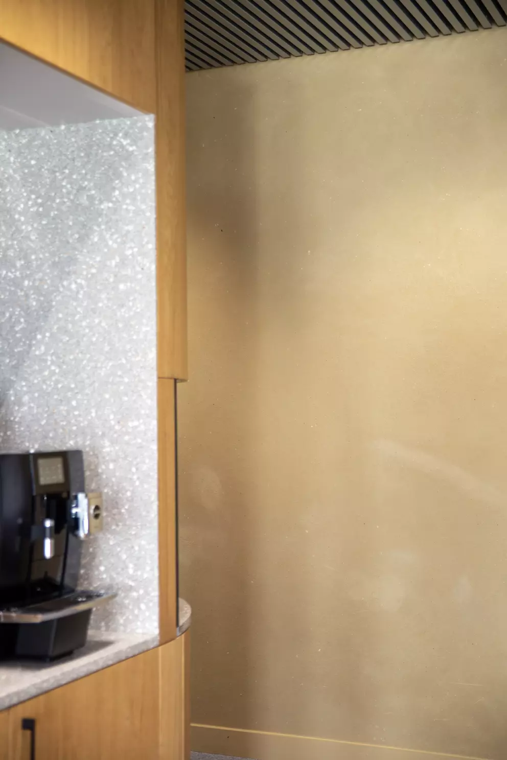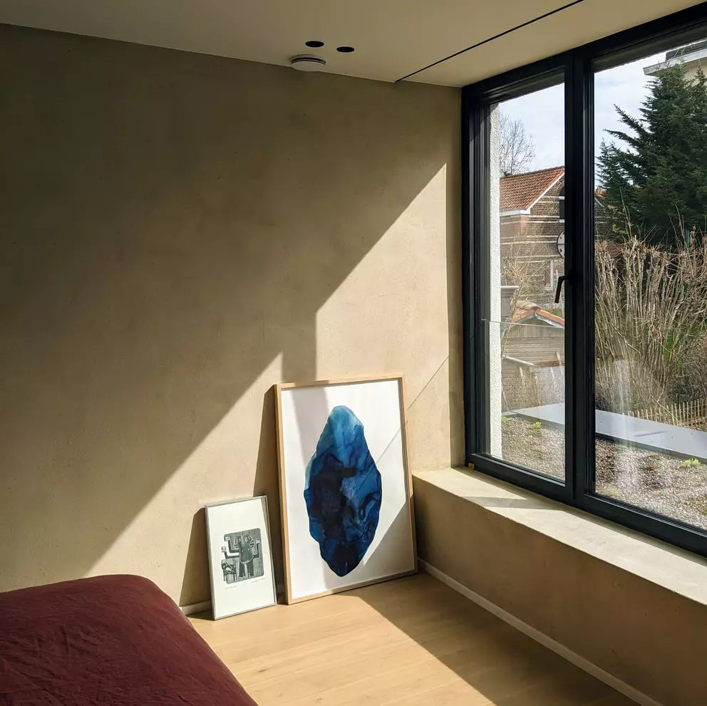 Léém Dunleempleister afwerking wordt gebruikt als een gladde afwerking, op een basispleister van klei, met alle gezondheids- en ecologische voordelen van kleipleister: circulariteit, geen koolstof en geen afval.