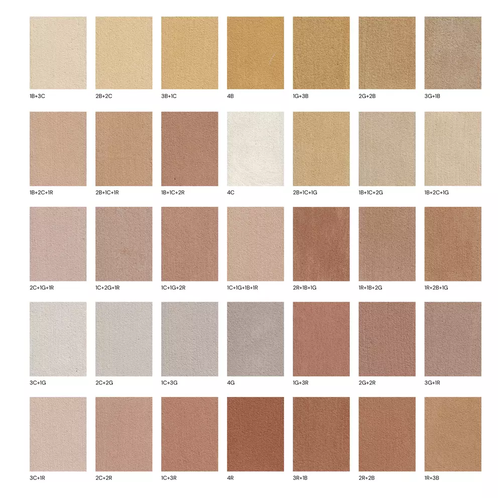 If you are looking for specific nuances to perfectly match your interior, we invite you to blend the dry powders of these four main colors together. You can easily explore our 35 suggested color recipes, or freely experiment to create your own unique, custom shade.